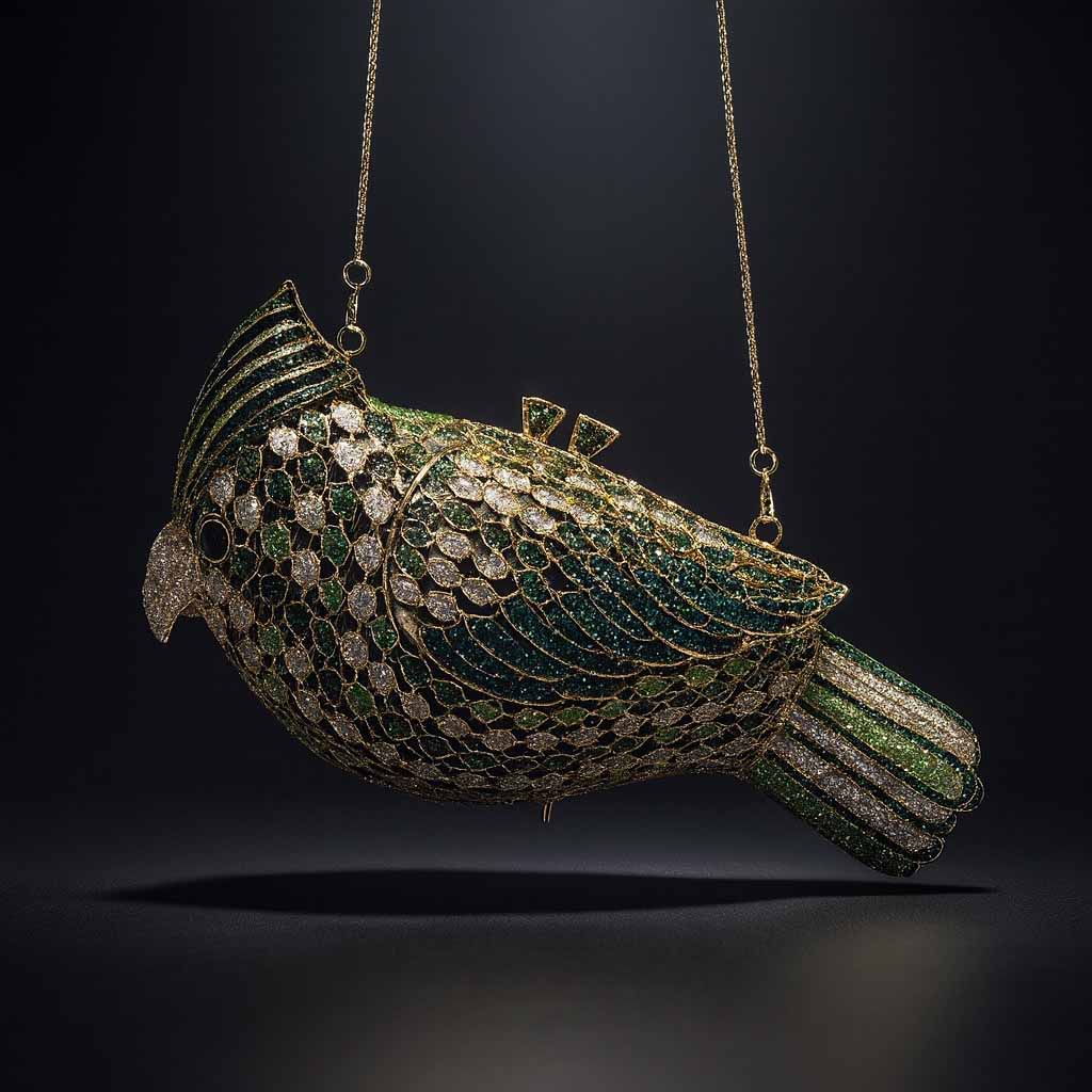Aviara is a masterpiece of jeweled craftsmanship—an opulent bird-shaped clutch designed for women who carry elegance with bold, artistic individuality. Inspired by the iridescence of exotic plumage, this sculptural accessory combines emerald greens, deep blacks, crystal whites, and golden undertones, each stone meticulously handset to create a dazzling multi-dimensional shimmer.