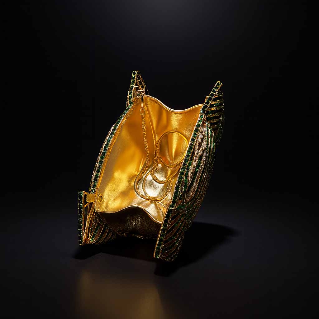 The interior opens to a rich, satin-gold lining that maintains both functionality and opulence. Despite its sculptural silhouette, Aviara offers thoughtful interior space for essentials and includes a side slip pocket for secure organization. A detachable gold chain allows you to style it as a clutch or shoulder piece, while the secure clasp closure ensures everything remains safe without interrupting the bag’s seamless artistry.
