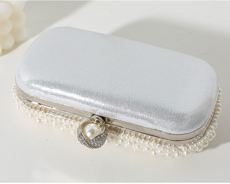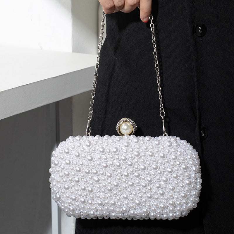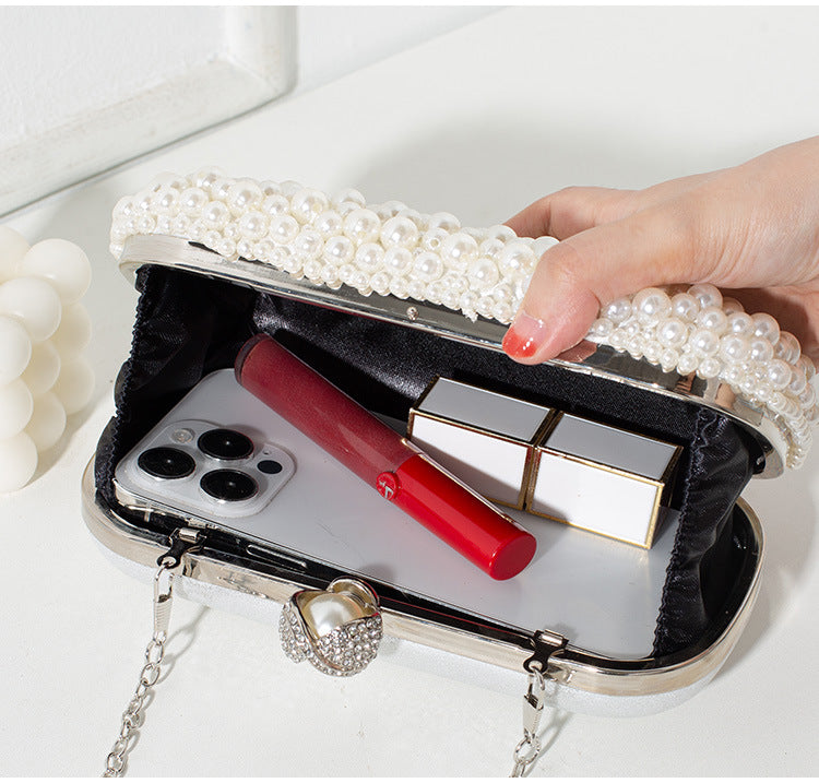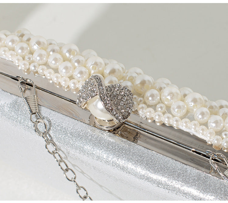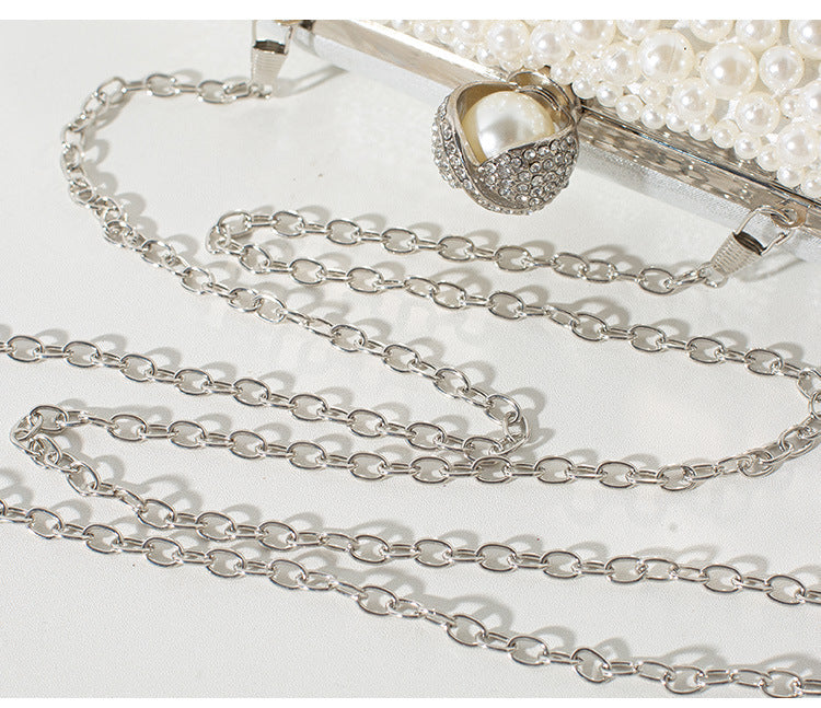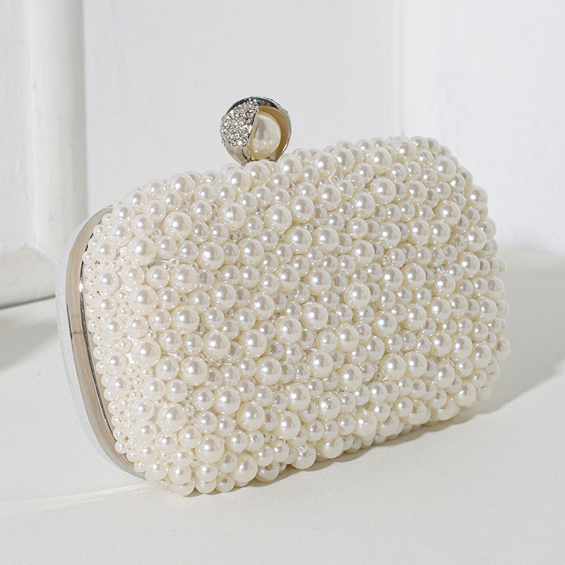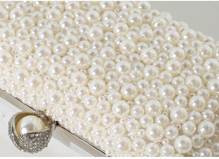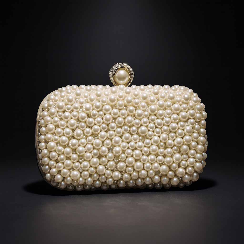 The exterior is adorned with a meticulously arranged constellation of lustrous faux pearls in varying sizes, creating a dimensional, cloud-like texture that glows under any light. Each pearl is placed with artisan precision, giving Celesté a soft yet opulent aura reminiscent of moonlit reflections on calm water. At the top, a jewel-inspired clasp featuring a single pearl encased in a halo of sparkling crystals adds the perfect finishing touch—refined, regal, and irresistibly feminine.